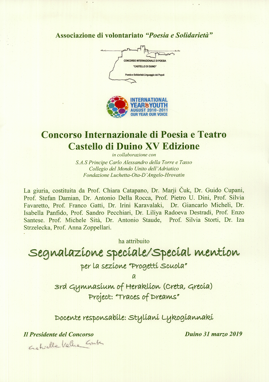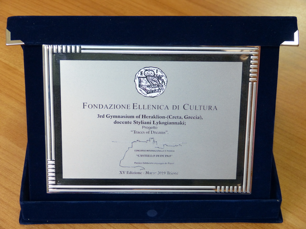 Η ποιητική συλλογή “Traces of Dreams” αποτέλεσμα της υλοποίησης καινοτόμων δράσεων στη διδασκαλία, δημιουργήθηκε μέσα από την εφαρμογή δραστηριοτήτων δημιουργικής γραφής στο μάθημα των Αγγλικών της καθηγήτριας Λυκογιαννάκη Στυλιανής στο πλαίσιο του Ευρωπαϊκού σχεδίου δράσης Erasmus+ /KA1 «Ενσωμάτωση καινοτόμων εκπαιδευτικών μεθόδων στο εκπαιδευτικό έργο». Έλαβε τιμητική διάκριση σε ετήσιο διεθνή διαγωνισμό ποίησης και ήταν ανάμεσα στις ομαδικές συμμετοχές σχολείων που ξεχώρισαν με ειδική μνεία στην τελετή απονομής βραβείων που έγινε στην Ιταλία στις 30 Μαρτίου 2019. Τα ποιήματα δημιουργήθηκαν απευθείας στην Αγγλική γλώσσα από μαθητές της Γ γυμνασίου στο μάθημα των Αγγλικών.